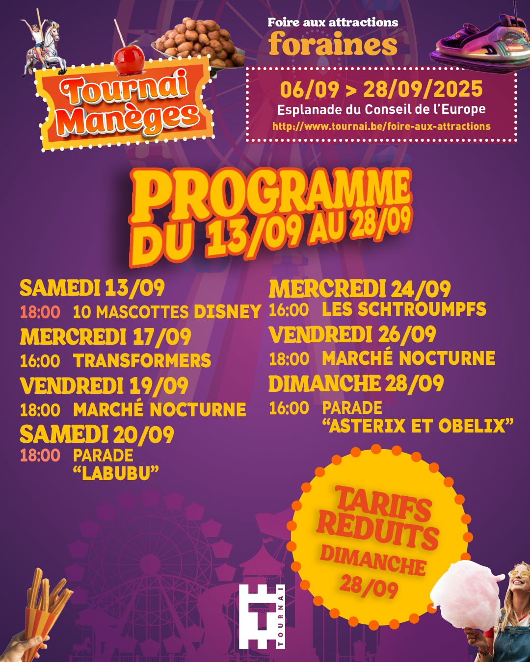 La Foire aux Attractions de Tournai est l’un des événements les plus attendus de la rentrée. Pendant plusieurs semaines, l’esplanade du Conseil de l’Europe se transforme en un immense parc d’attractions à ciel ouvert, attirant petits et grands. C’est le lieu idéal pour une sortie en famille ou entre amis, où vous pourrez profiter des manèges à sensations fortes, des attractions pour enfants et des nombreuses gourmandises foraines comme les croustillons et les barbes à papa.